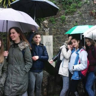 Tradicionalno polaganje cvijeca ispred biste umjetnika Petra Lubarde na Karači.