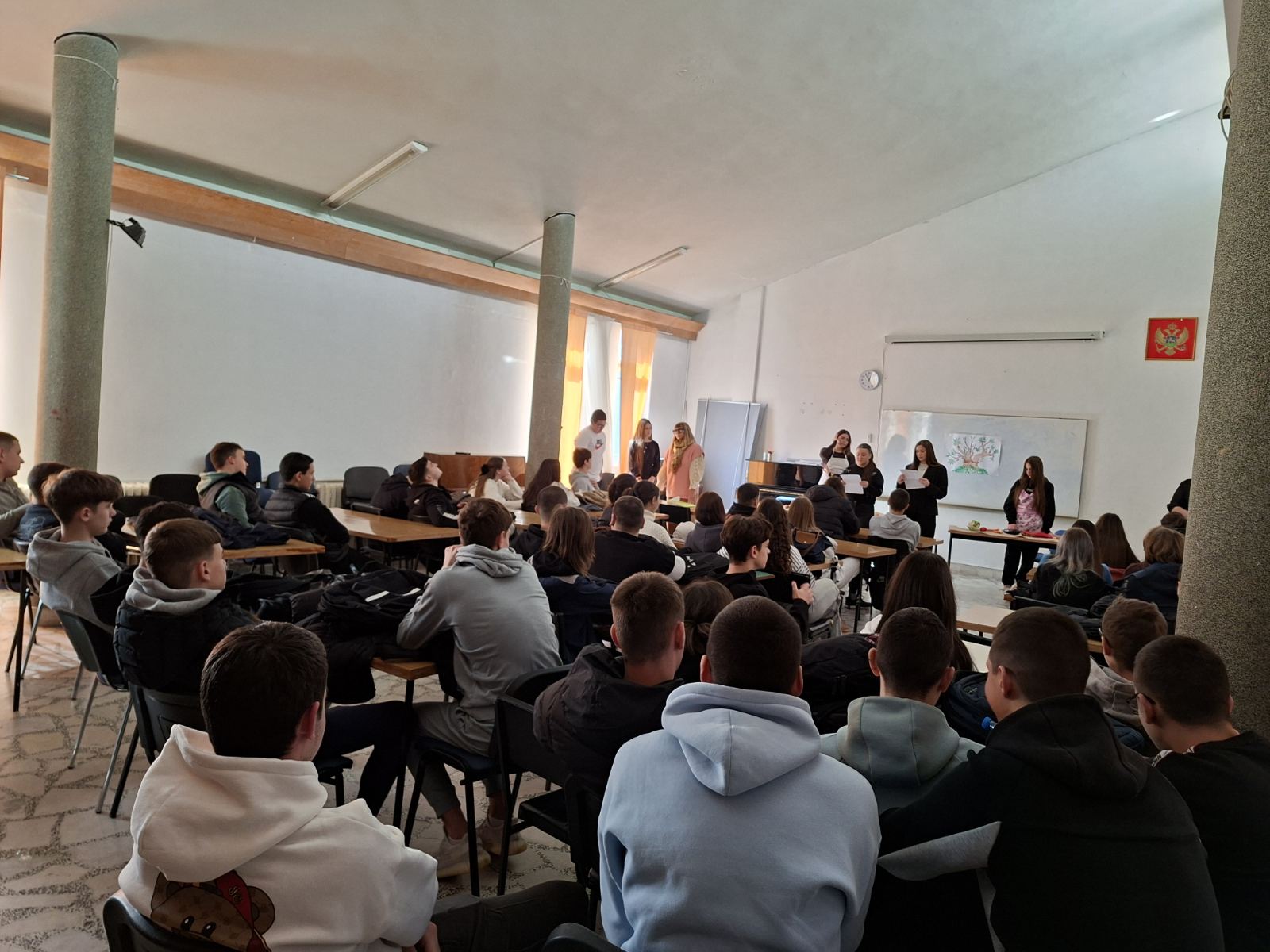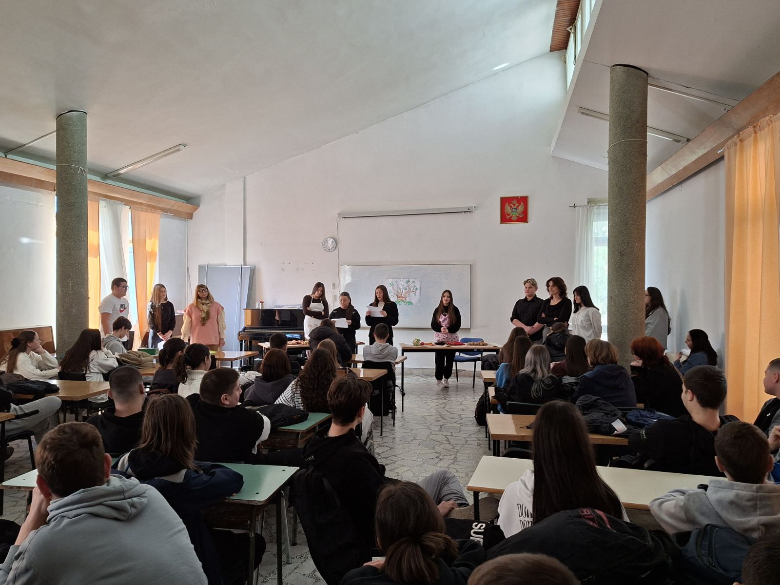 Povodom obilježavanja Međunarodnog dana maternjeg jezika, u srijedu, 18.02.2026.godine, u Svečanoj sali škole, profesorice Zorica Marković i Biljana Baćović, sa učenicima iz Ie, It, IIIgr, Izt, Iu1, IIgr, održale su ogledni čas iz Crnogorsko-srpskog,bosanskog,hrvatskog jezika i kniževnosti, sa ciljem da se ukaže na značaj očuvanja jezika, kulture, tradicije i identiteta naroda.